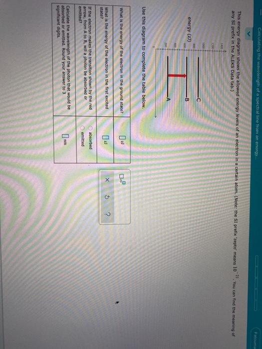 2/28/2021 ALEKS ; 1/3 QUESTION This energy diagram shows the allowed energy levels of an electron in a certain atom. ( Note: the SI prefix 'zepto' means . Jahann Balmer in 1885 derived an equation to calculate the visible wavelengths that the hydrogen spectrum displayed. The lines that appear at 410 nm, 434 nm, 486 nm, and 656 nm. These electrons are falling to the 2nd energy level from higher ones. This transition to the 2nd energy level is now referred to as the "Balmer Series" of electron ... Calculate the wavelength of the photo that would be absorted Initted. Round your answer to significant Explanation Check This energy diagram shows the allowed energy levels of an electron in a certain atom. (Note: t ny SI prefix in the ALEKS Data tab.) 1400 1200 1000 - c 800 energy (23) 600 DU 400 200 0 Use this diagram to complete the table below. The diagram below shows the line spectrum of a gas. € 1 Explain how line spectra are produced. In your answer you should describe: •€€€€€€€€how the collisions of charged particles with gas atoms can cause the atoms to emit photons. •€€€€€€€€how spectral lines are explained by the concept of discrete energy ...