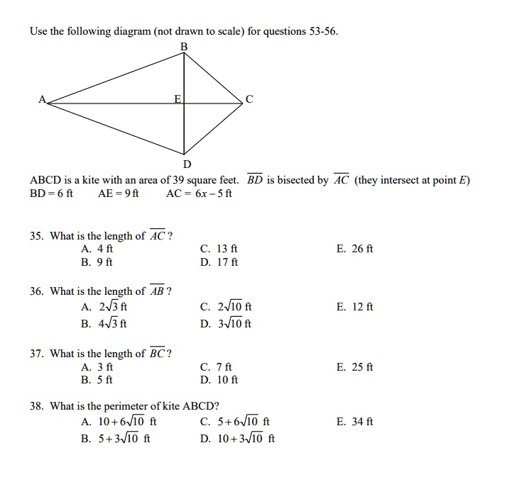 Solved Use The Following Diagram Not Drawn To Scale For Questions 53 56 Abcd Is Kite With An Area 0f 39 Square Feet Bd Is Bisected By Ac They Intersect At Point E Bd
