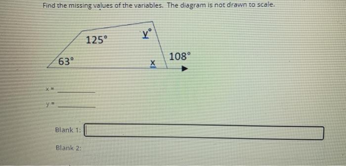10 Feb 2021 — Find the missing values of the variables. The diagram is not to scale. 119 106° 74 Get the answers you need, now!1 answer · 8 votes: Answer:x = 93, y = 74Step-by-step explanation:y and 106 are supplementary angles, in other words, y+106 = 180y = 74All the angles in a quadrilateral added ...