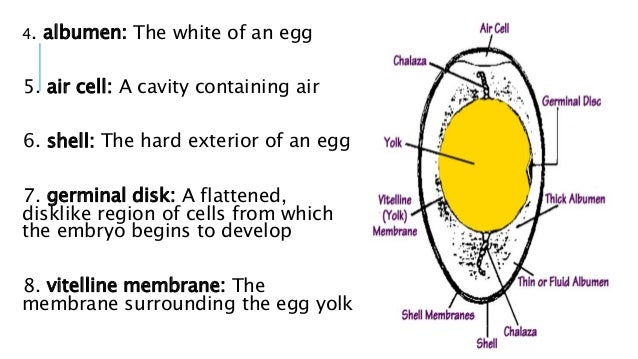 Start studying Parts of the Egg. Learn vocabulary, terms, and more with flashcards, games, and other study tools. Using the diagram on the SMART board, discuss the different parts: shell= hard protective coating of the egg, yolk= yellow part of the egg that contains liquid food, albumen= the white-ish part of the egg that contains water and food, air cell= space at the end of the egg where the chick will take its first breath, membrane= grows around the ... About Press Copyright Contact us Creators Advertise Developers Terms Privacy Policy & Safety How YouTube works Test new features Press Copyright Contact us Creators ... Anatomy of the Egg. In order to understand the anatomy (inside parts) of the egg, it is helpful to review the reproductive tract of the laying hen. If you have not completed the reproductive tract exercise yet, you should before doing the exercises on these pages. CLICK HERE to go to the reproductive tract exercise.