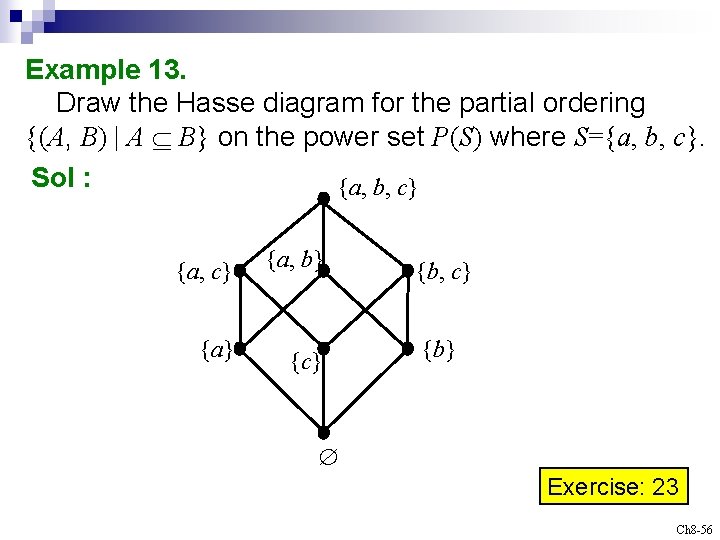 A Hasse diagram is a graphical representation of the relation of elements of a partially ordered set (poset) with an implied upward orientation.A point is drawn for each element of the partially ordered set (poset) and joined with the line segment according to the following rules: If p<q in the poset, then the point corresponding to p appears lower in the drawing than the point corresponding to q. This lecture covers the real life comparison of equivalence relation and then introduces the idea of partial order and its representation using hasse diagram... Here is an exercise for you to practice. The prerequisite for Hasse Diagram is to know how to represent relations using graphs. Let A be a poset, A = { 2, 4, 6, 8 } and the relation a | b is ‘a divides b. Draw a Hasse Diagram for the poset showing all the relations.