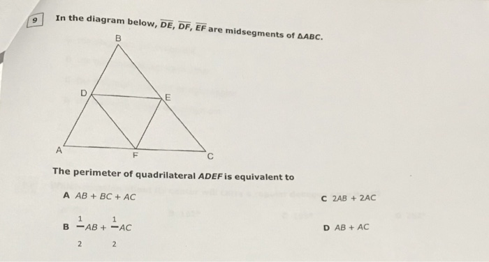 Math. Geometry. Geometry questions and answers. In the diagram below, DE, DF, EF are midsegments of AABC The perimeter of quadrilateral ADEF is equivalent to A AB + BC+AC C 2AB +2AC D AB + AC B-AB +-AC. 11 In the diagram below, DE, DF, and EF are midsegments of ABC. The perimeter of quadrilateral ADEF is equivalent to. 1) AB + BC + AC. 2). 1.9 pages