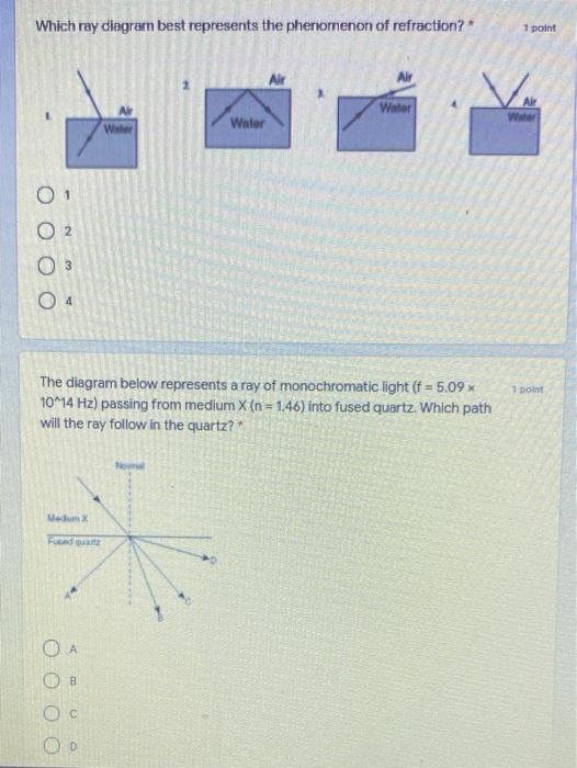Which diagram best represents the direction of ... best illustrates the phenomenon of ... letter represents the angle of refraction for the light ray?24 pages