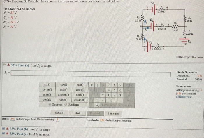 (7%) Problem 3: Consider the circuit in the diagram, with sources of emf listed below, ca 0.10 0 Randomized Variables E = 22 V 5.0 20 0 EL = 42 V [T, KyHe 1 0.50 40 a . E3 = 6.5 V a E4 = 38 v 0.20 0 78 a ji 05 a h Otheexpertta.com A 33% Part (a) Find I1 in amps. a 33% Part (b) Find 12 in amps.