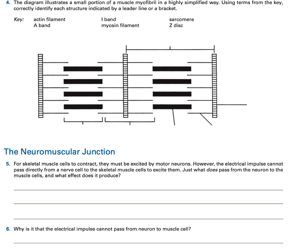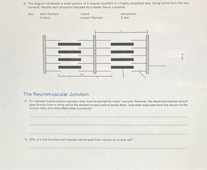 The diagram illustrates a small portion of several myofibrils. Correctly label all the structures defined in your lab manual. Problem 5E: The diagram illustrates a small portion of several myofibrils. Using letters from the key, correctly identify each structure indicated by a leader line or a diagramweb.net:a. A bandb. actin filamentc. 300zx Intercooler Piping Diagram; 164d3871p001 Parts Diagram; 2002 Chrysler Voyager 2.4 Engine Wiring Diagram; Argo V693-36 Wiring Diagram; Comets And Asteroids Venn Diagram; Rd200 Wiring Diagram; The Diagram Illustrates A Small Portion Of Several Myofibrils; Wiring Diagram Angled 3 Way Switchcraft; R30-1 Plug Wiring Diagram; 2006 Bmw 330i ... The diagram illustrates a small portion of several myofibrils. Using letters from the key, correctly identify each structure indicated by a leader line or a bracket. Key: a A band d. myosin filament g triad b. actin filament e. Ttubule c. I band h. sarcomere t. terninal cisterm i. Zdisc 6. On the following figure, label a blood vessel,