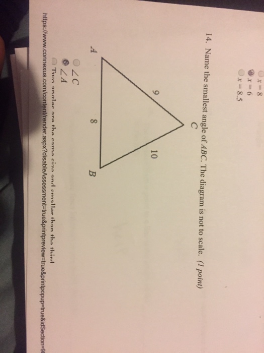Name the smallest angle of ∆abc . the diagram is not to scale.. negative particle, a word expressing negation, denial, refusal, or prohibition, mid-13c., unstressed variant of noht, naht "in no way" (see naught). As an interjection to negate what was said before or reveal it as sarcasm, it is attested by 1900, popularized 1989 by "Wayne's World" sketches on "Saturday Night Live" TV show. Not, spoken with emphasis, often stands for the negation of a whole sentence referred to: as, I hope not (that is, I hope that the state of things you describe does not exist). [Century Dictionary, 1895] To not know X from Y (one's ass from one's elbow, shit from Shinola, etc.) was a construction attested from c. 1930 in modern use; but compare Middle English not know an A from a windmill (c. 1400). Double negative construction not un- was derided by Orwell, but is persistent and ancient in English, popular with Milton and the Anglo-Saxon poets. "to fish with a hook," mid-15c., from Old English angel (n.) "angle, hook, fish-hook," related to anga "hook," from Proto-Germanic *angul-, from PIE *ankulo-, suffixed form of root *ang-/*ank- "to bend" (see angle (n.)). Compare Old English angul, Old Norse öngull, Old High German angul, German Angel "fishhook." Figurative sense "catch or elicit by artful wiles" is recorded from 1580s. Related: Angled; angling. Name the smallest angle of ∆ABC. The diagram is not to scale. a. ∠B b. ∠A c. ∠C d. Two angles are the same size and smaller than the third.10 pages Name the smallest angle of ∆ABC. The diagram is not to scale. ... The diagram is not to scale. 19. Find the measure of the numbered angles in the rhombus.9 pages