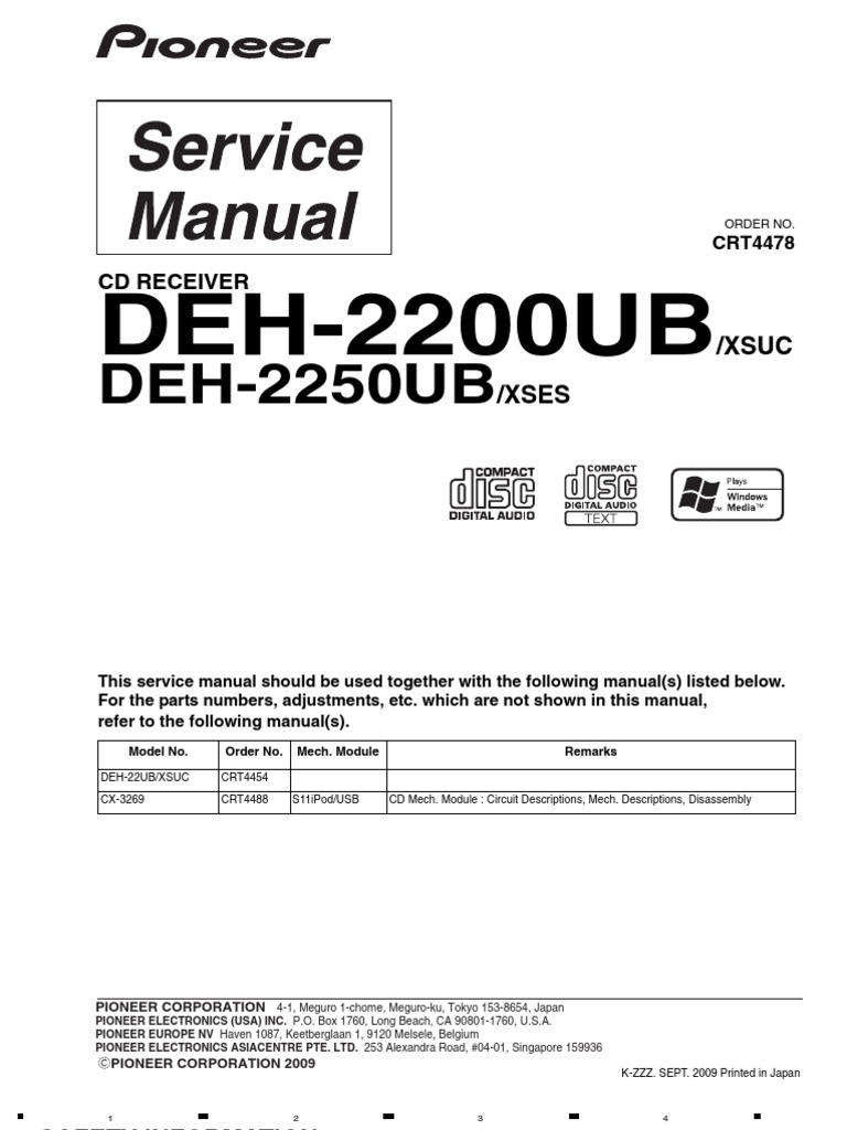 User/Owner manual for Pioneer DEH-2200UB (original from manufacturer) [Definition] Download (Acrobat .PDF) Greek: US$ 9.5: Service ... Service (repair) manual: Depending on the type of product, a service manual includes schematic and block diagrams, printed wiring boards, waveforms, parameters and IC pin descriptions, parts list, drawings and ...
