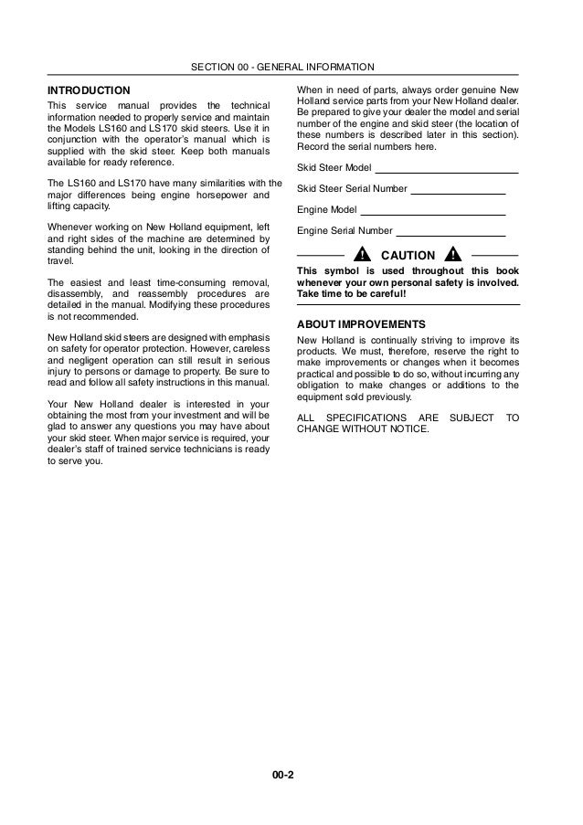 Wiring Diagrams: Yes Hydraulic Diagrams: Yes. Model. New Holland Skid-Steers. LS160 LS170. LS160 - N844 (Before Engine S/N 124735) LS170 - N844T (All) LS160 - N844 (Tier II Engine, S/N 124735 and after) Contents-GENERAL INFORMATION Introduction About Improvements Company Policy Parts and Accessories Model Codes Precautionary Statements