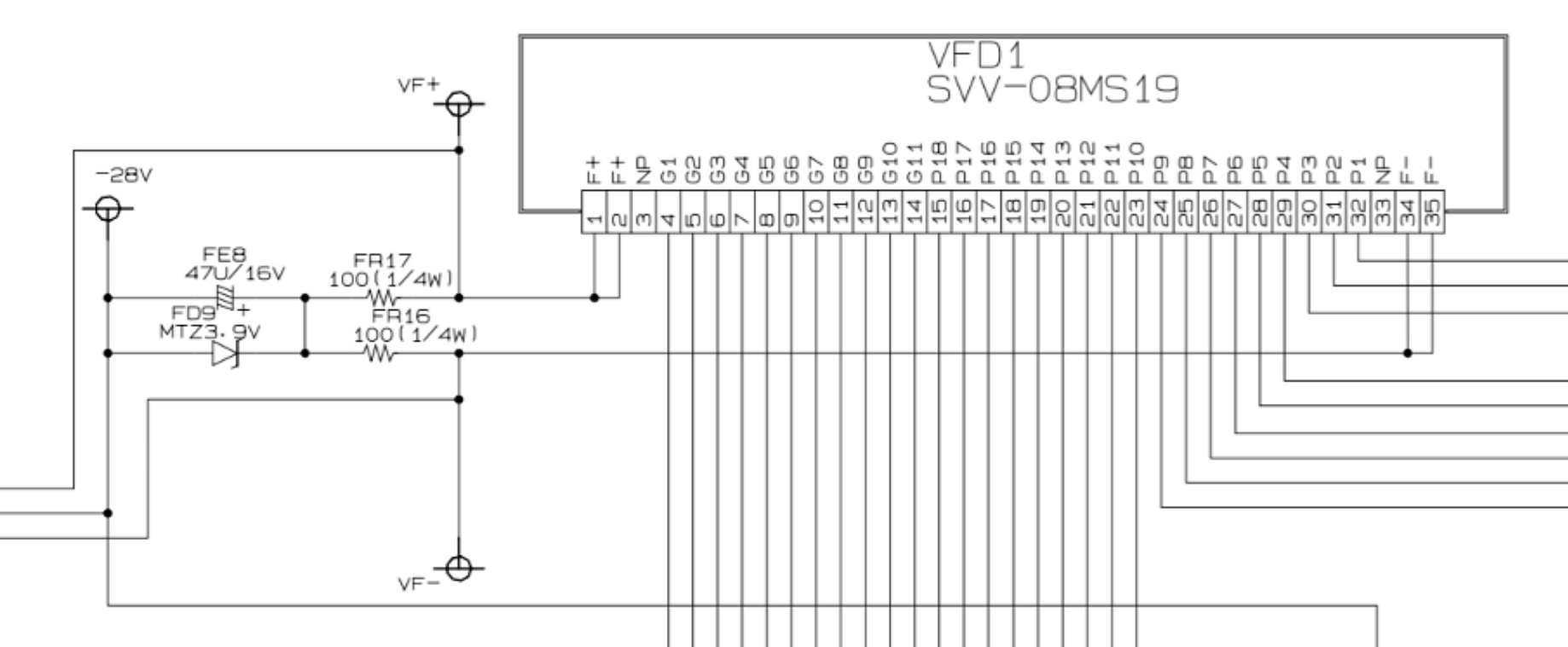 Futaba Vacuum Fluorescent Display M202MD15DA, with Futaba VFD. FIGURE-2 CIRCUIT BLOCK DIAGRAM xxxxxxxxxxxxxxxxxxxxxxxxxxxxxxxxxx 11. FIGURE-3 CHARACTER DISPLAY CODE xxxxxxxxxxxxxxxxxxxxxxxxxxxxxxx 12. It's a small metal can, two pins, marked 3828NDK02? (the last character is illegible) - out of a device manufactured in 1990. Unfortunately, I don't have a circuit level diagram or BOM for the device it's in, but it's clearly part of the driver circuitry for a vacuum fluorescent display. The part has physically failed - it was acting like a cold solder joint, but resoldering the component didn't help, so the flaky connection appears to be inside the can. That's.. sub-component-level repair, so ... Philips Semiconductors Linear Products. Vacuum fluorescent display driver. Product specification. NE/SA594. DESCRIPTION. There is an active pull-down circuit on each output so that display ghosting is minimized and no external components are required for most fluorescent display... A simple interface circuit to drive VFD displays. No fancy parts required, and runs on serial communication.
