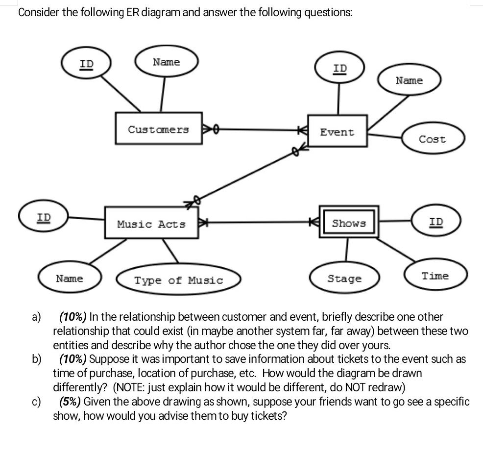 Er diagram examples with solutions pdf. Online Library Er Diagram Examples With Solutions and examples have been added throughout the book, including SQL and Oracle examples. The applied flavor is further enhanced by the two new database applications chapters. Software Blueprints Describes ways to incorporate domain modeling into software development. performance. The entity-relationship diagram above shows the one-to-one link between a ticket holder and a concert hall seat. In an orchestra, each individual will play one type of musical instrument; for example, a person who plays a violin will not play a trumpet. The relationship is one-to-one from a member of the orchestra to a type of ... 1 Entity Relationship Diagram (ERD) - Exercises Exercise 1 Draw an ER diagram for the following application from the hospital: A doctor has one or more patients to treat Each doctor has an unique Doctor ID Each patient has a name, phone number, address and date of birth Patient entity is a weak entity Age is a derived attribute Exercise 2 Draw an ER diagram for the following application from ... Note: The following questions refer back to the above ER diagram for problem 3. b. Please identify an attribute in the above ER diagram that might represent a composite attribute, and explain why/how it might represent a composite attribute (3 pts). Answer: Many of the attributes could actually represent composite attributes: