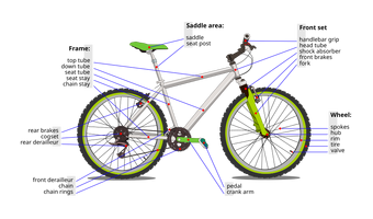 Bike parts and their functions in English. Brake - devices used to stop or slow down a bicycle. Frame - the mechanical core of a bicycle, the frame provides points of attachment for the various components that make up the machine. Head tube - the tube of a bicycle frame that contains the headset. Seatpost - a post that the seat is ... The bike's suspension, important in a rough-riding dirt bike, has two parts. The rear shocks, under the rider, attach to the rear axle via the swing arm. The swing arm is the part of the bike that attaches horizontally to the rear axle. Front suspension is by means of the front forks. These stretch from the front of the bike, on either side of ... Terms from diagram above: Seat Stays: The seat stays are part of the bicycle frame. ... Quick links to specific bicycle sections & parts:. Below you'll find the most accurate and detailed parts of a bike diagram. By learning each of your bike's components and understanding basic bicycle anatomy ...Ball Bearings: The ball bearings of a bike hub sit ...Lock Nut: Lock nuts are used to lock the hub’s ...Hub Shell: The outer shell of the hub, often ma...