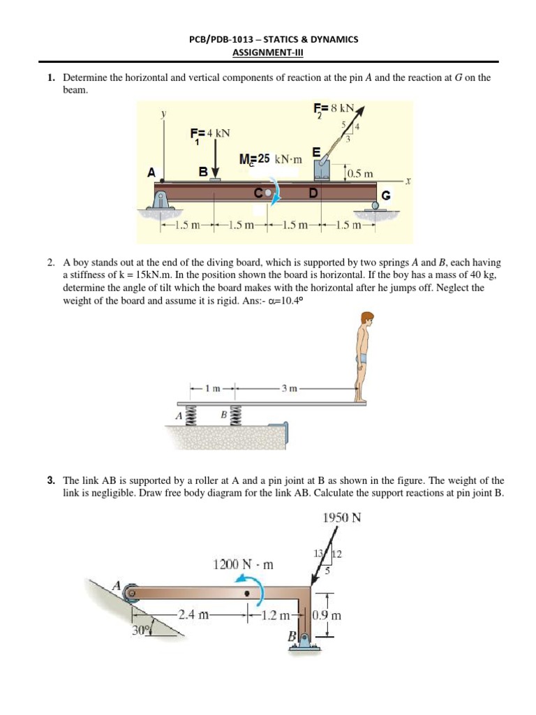 Draw the free-body diagram of the beam, which is pin- connected at A and rocker-supported at . B. 5-12 5.3 Equations of Equilibrium Free-Body Diagram Draw an outlined shape of the body. Show all the forces and couple moments acting on the body. ... the beam caused by the pin at B and the rocker at A. • Neglect the weight of the beam. Find : Solution Free-body diagram • Resolve the 600-N force into its Classify the beams shown in Figure 3.1 through Figure 3.5 as stable, determinate, or indeterminate, and state the degree of indeterminacy where necessary.. Fig. 3.1. Beam. Solution. First, draw the free-body diagram of each beam. To determine the classification, apply equation 3.3 or equation 3.4.. Using equation 3.3, r = 7, m = 2, c = 0, j = 3. Applying the equation leads to 3(2) + 7 > 3(3 ... A is a pin and b is a rocker. Draw the free body diagram for the beam. Draw a fbd of the 1000 lb weight. The above diagrams which show the complete system of applied and reactive forces acting on a body are called free body diagrams. The whole system of applied and reactive forces acting on a body must be in a state of equilibrium.
