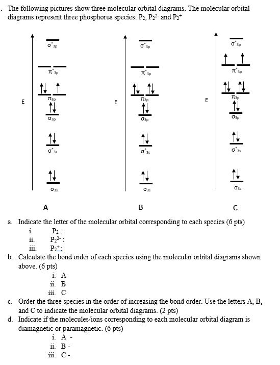 The orbital diagram for a diatomic molecule is. To find the bond order, add the 15 electrons in the molecular orbitals (the blue-colored They completely fill all the orbitals except the highest-energy antibonding sigma 2p orbital. Thus, there will be 8 bonding electrons and 7 antibonding electrons...