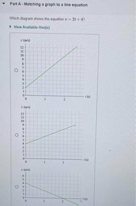 Physics questions and answers. Part A - Matching a graph to a line equation Which diagram shows the equation v = 2t + 4? 8 of 10 > Review | Constants Part A - Matching a graph to a line equation Which diagram shows the equation v = 2t +42 View Available Hint (s) (m/s) (m/s) Q Search or enter website name.