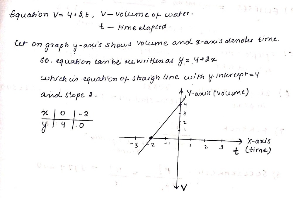 The given equation, V = 4 + 2t, is a linear function, which means that its graph is a line. The slope of such graph is constant ; it is the coefficient of the independent variable (t in this case) and the constant term (4 in this case) is the initial value of the function (when t = 0).