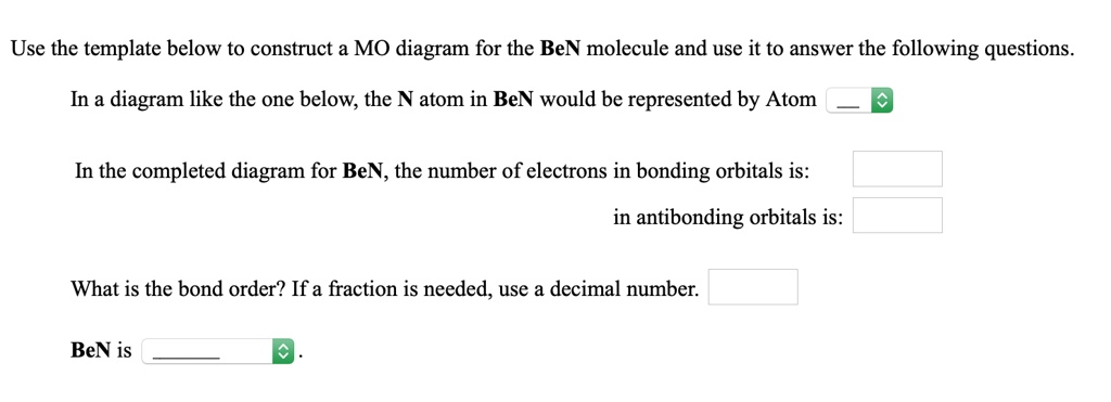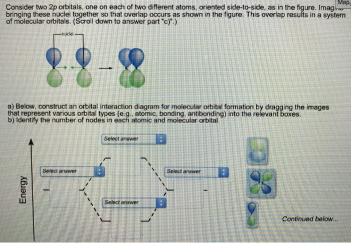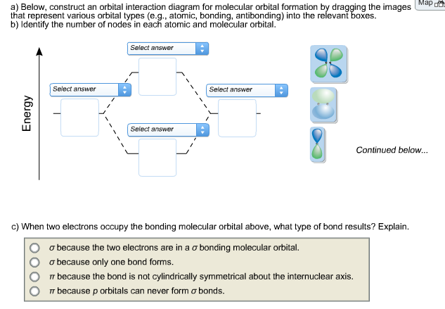 Dec 11, 2019 · Below, construct an orbital interaction diagram for molecular orbital formation by dragging the image that represents various orbital types (e.g., atomic, bonding, antibonding) into the relevant boxes. b) Identify the number of nodes in each atomic and molecular orbital.