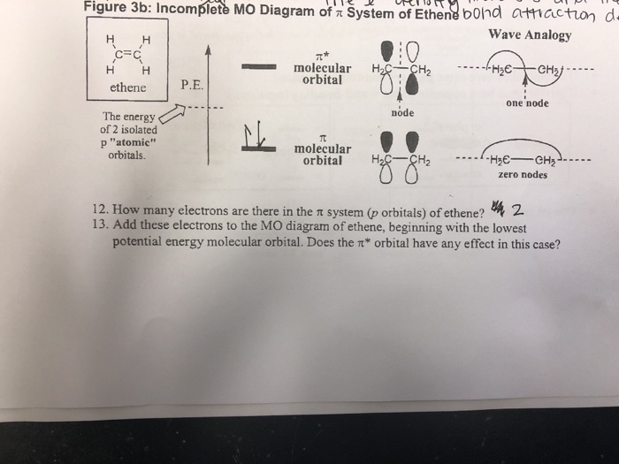 The other sp2 hybrid orbitals form sigma bonds between C and H, therefore, leading to C-H single bonding structure. C2H4 Molecular Orbital (MO) Diagram. The molecular orbital theory is a concept of quantum mechanics where atomic linearly combines to form molecular orbitals and we describe the wave nature of atomic particles. Construct the molecular-orbital energy level diagrams of (a) ethene and (b) ethyne on the basis that the molecules are formed from the appropriately hybridized CH2 or CH fragments. (For clarity, you may omit the orbitals involved in the carbon-hydrogen bonds and only show the orbitals involved in the carbon-carbon bonds.) Ethene vs. ammonia. Postby Ella Bogomilsky 2B » Mon Nov 15, 2021 3:09 am. In ammonia, the 5 valence electrons on nitrogen all go into the hybridized orbitals. In ethene, the 4 valence electrons on carbon go into the hybridized orbitals, and one goes into the unhybridized p orbital. Why does this happen?