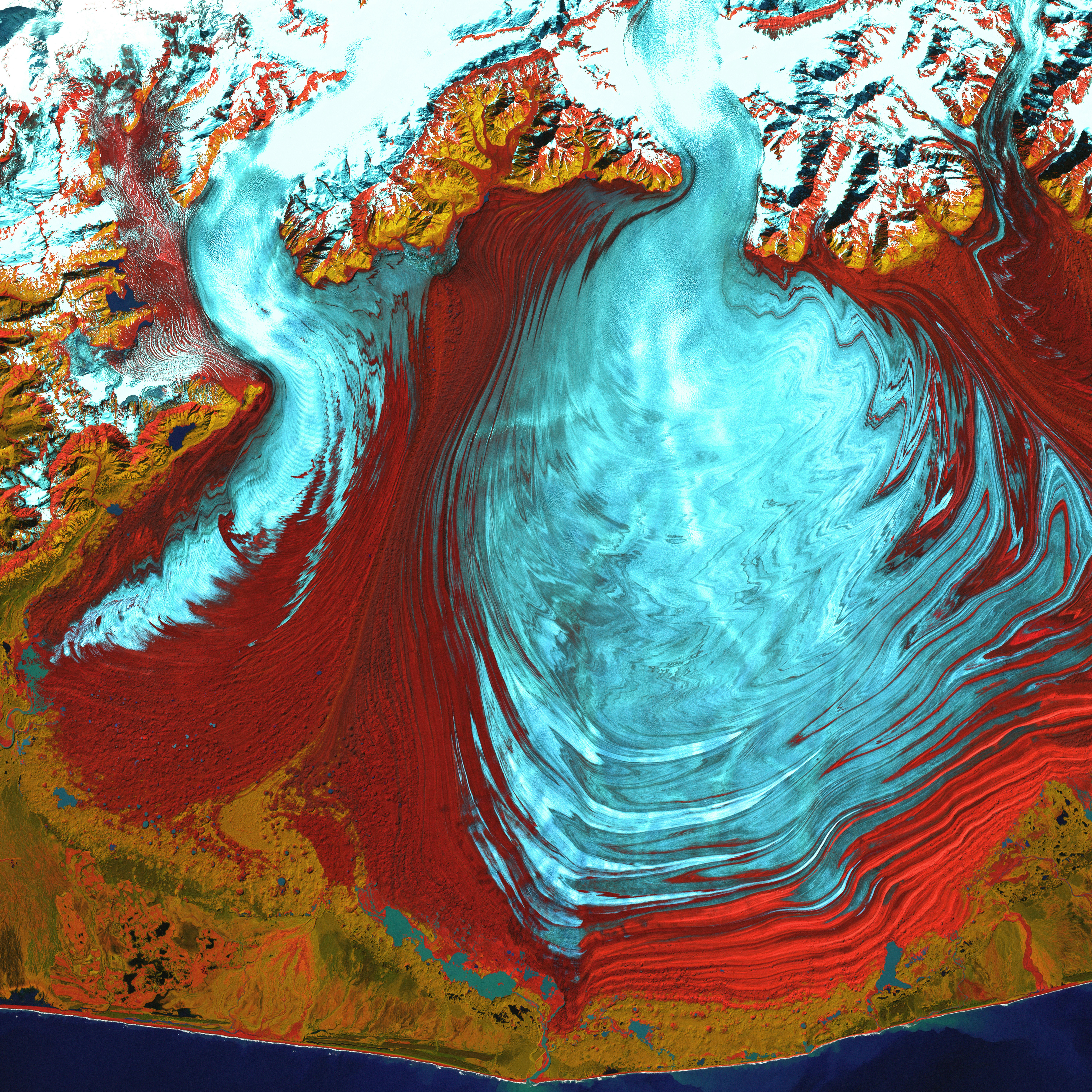 The tongue of the Malaspina Glacier, the largest glacier in Alaska, fills most of this image. The Malaspina lies west of Yakutat Bay and covers 1,500 sq mi (3,880 sq km).