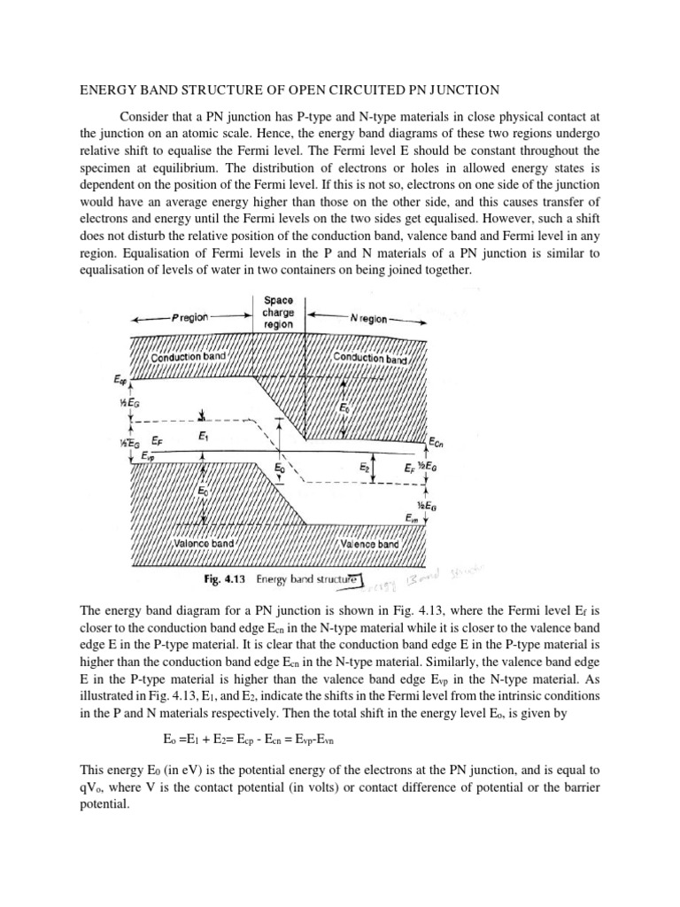 Apr 10, 2013 · The energy band diagram of the pn junction under open circuit conditions is shown in Figure 6.11a. There is no net current, so the diffusion current of electrons from the n — to p-side is balanced by the electron drift current from the p — to n-side driven by the built-in field *E0. Similar arguments apply to holes.