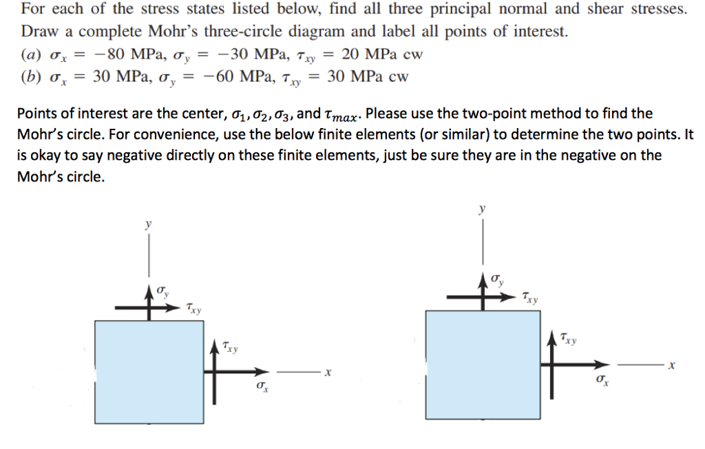 For each of the stress states listed below, find all three ... Draw a complete Mohr's three-circle diagram and label all points of interest. (a) \sigma_ {x}=-80 \mathrm {MPa}, \sigma_ {y}=-30 \mathrm {MPa}, \tau_ {x y}=20 \mathrm {MPa} \mathrm {cw} σx = −80MPa,σy = −30MPa,τ xy = 20MPacw (b) \sigma_ {x}=30 \mathrm {MPa}, \sigma_ {y}=-60 \mathrm {MPa}, \tau_ {x y}=30 \mathrm {MPa} \mathrm {cw} σx = 30MPa,σy