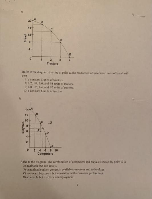15 Refer to the diagram Starting at point E the production ... 15. Refer to the diagram. Starting at point E, the production of successive units of bread will cost: A. a constant 8 units of tractors. B. a constant 6 units of tractors. C. 1 / 8, 1 / 6, 1 / 4, and 1 / 2 units of tractors. D. 1 / 2, 1 / 4, 1 / 6, and 1 / 8 units of tractors.