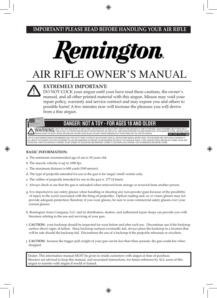 PDF MANUAL 2244010 2244001 2244002 Ruger Airhawk Blackhawk ... 1. Learning the Parts of Your Air Rifle 2. Operating the Safety 3. Cocking your Air Rifle 4. Loading your Air Rifle 5. Closing the barrel 6. Aiming at a safe target 7. Firing your Air Rifle 8. Adjusting the Sights 9. Adjusting the Trigger 10. Trouble Shooting 11. Care and Maintenance 12. Reviewing Safety 13. Repair / Service / Warranty