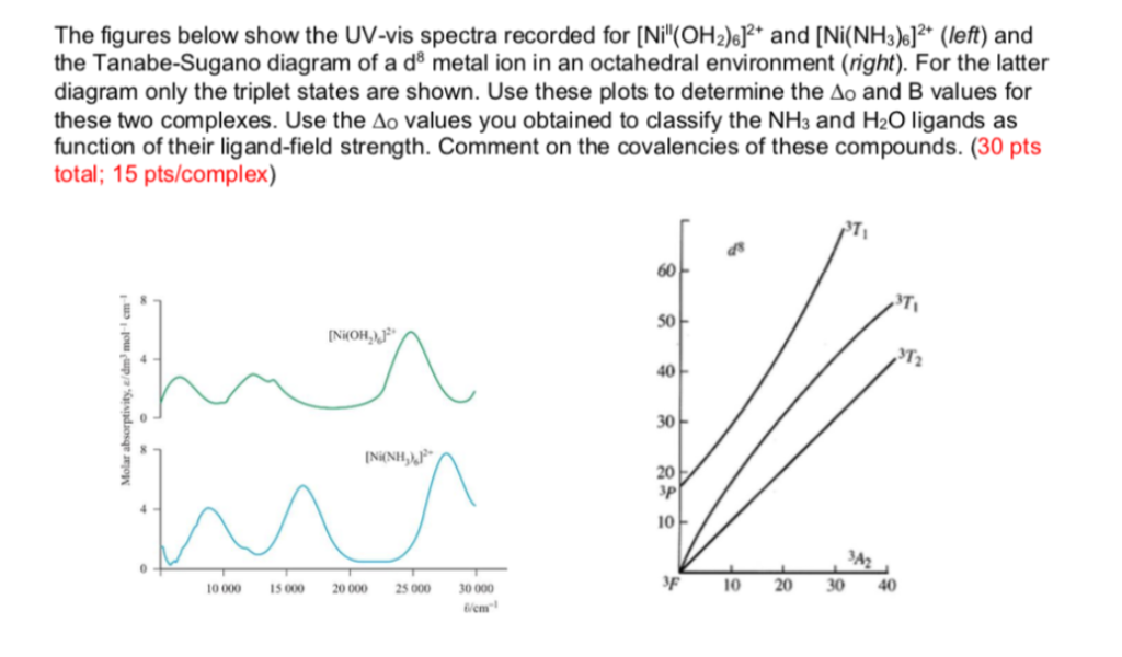 [Solved] Use the d8 TanabeSugano diagram provided to (i ... Use the d8 Tanabe‐Sugano diagram provided to (i) determine and B for the two Ni2+ octahedral complexes shown in the following spectra, and use these values to (ii) determine the nephelauxetic ratio for each complex. The B value for a free Ni2+ ion is 1086 cm−1 . Which ligand generates a stronger ligand field?