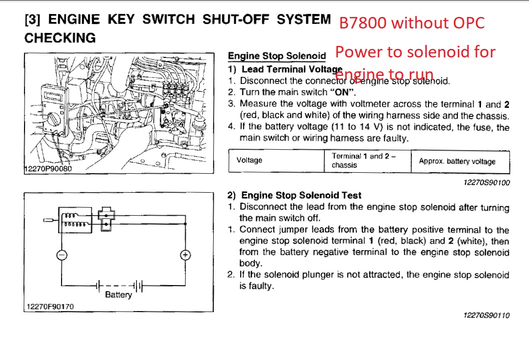 B7800 switch? Issue | OrangeTractorTalks - Everything Kubota The tractor's wiring diagram shows the two solenoid coils connected to one external wire just like the B7800 wiring diagram shows and no internal switch is present. The section of the WSM describing testing the stop solenoid (remember this is the same tractor and same stop solenoid) shows an internal switch which opens as soon as the solenoid ...