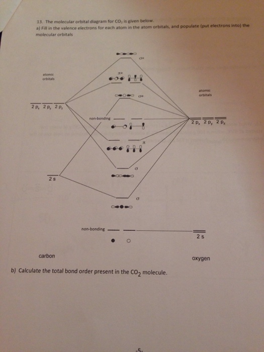 Carbon Oxides - University of Illinois Urbana-Champaign Carbon dioxide is electron-poor at the central carbon and acts as an electrophile. The molecular orbital diagram of carbon monoxideis very similar to that of molecular nitrogen. Carbon, with 4 valence electrons, and oxygen with 6 valence electrons, together have the same number of electrons as dinitrogen. CO2 Lewis Structure, Hybridization, Molecular Geometry ... CO2 Molecular Orbital (MO) Diagram The molecular orbital diagram of CO2 is as below. A molecular orbital diagram of any compound gives us an idea about the bonding of the orbitals. It also helps us to find the bond order, bond length, bond strength of the molecule. In the diagram, the left-hand side consists of the atomic orbitals of carbon.