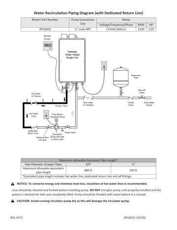 PDF Hot Water Recirculating System Installation Instructions The table on page 4 provides the list of water heaters that have the recirculation logic feature. Ground! Remote Control Tankless Water Heater Single Unit Hot Water to Fixtures Hot Water Loop Dedicated Return Line Circulation Pump with built in check valve Expansion Tank Wire to Connect Pump to heater (8 ft long) Cold water to Tankless Cold ...