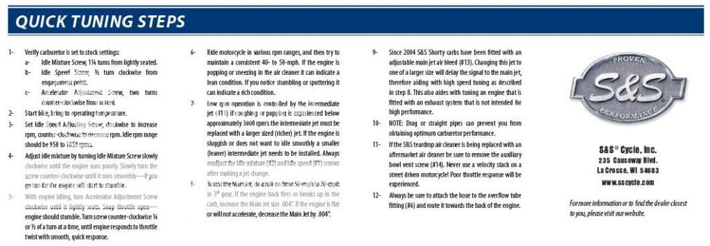 Carb Quick Guide | S&S Cycle Download the Carb Tuning Guide Watch the Super E & G Carb Basic Setup video Verify carburetor is set to stock settings: Idle mixture screw, 11/4 turns from lightly seated. Idle speed screw, ½ turn clockwise from engagement point. Accelerator adjustment screw, two turns counter-clockwise from seated. Start bike, bring to operating temperature.