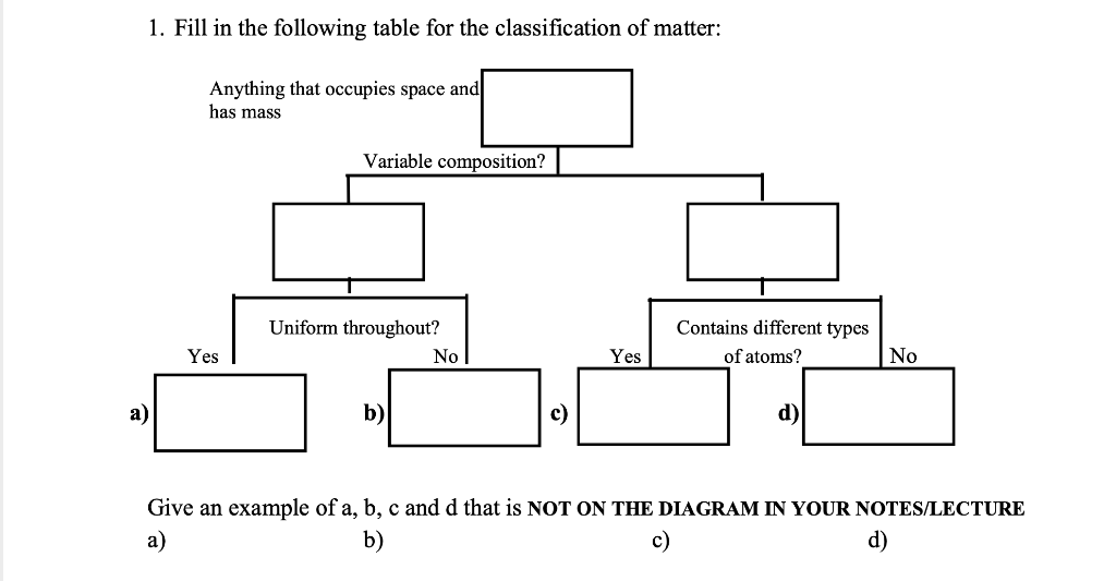 Classification of matter and particle diagrams New (1 ... View Classification of matter and particle diagrams New (1).docx from CHEMISTRY N/A at North High School. Elements, Compounds & Mixtures Worksheet Part 1: Read the following information on elements, Classification of Matter Flow Chart by Danika Eisentraut Classification of Matter Flow Chart Homogeneous Mixtures Mixture where components are uniformly distributed throughout the mixture. Matter Term for any type of material. Anything that has mass and takes up space. Ex. Blood plasma Electron A stable negatively charged charged Classification of Matter | Boundless Chemistry The states of matter: This diagram shows the nomenclature for the different phase transitions. Solids A solid's particles are packed closely together. The forces between the particles are strong enough that the particles cannot move freely; they can only vibrate. As a result, a solid has a stable, definite shape and a definite volume. classification of matter : The University of Akron, Ohio State that we can categorize all matter by the use of this diagram but there is another scheme that is more practicable. It involves four categories metals, ceramics, polymers, and composites. Without defining each have the students place their object in one of the four categories and state the reasons for their selection.