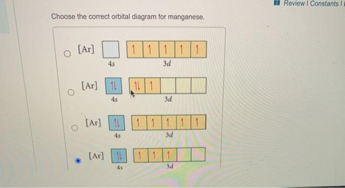 Solved Review I Constants / Choose the correct orbital ... Question: Review I Constants / Choose the correct orbital diagram for manganese, O [Ar] 11 1 1 3d 45 [Ar] 11 111 4s 3d [Ar] 11 1 1 1 1 1 3d 4s [Ar] 11 111 3d This problem has been solved! See the answer Show transcribed image text Expert Answer 100% (4 ratings)