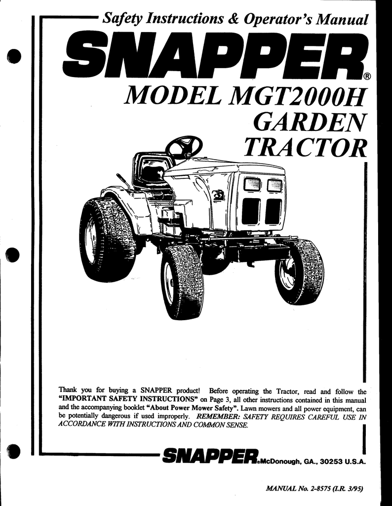 SNAPPER LT-200 SERIES OPERATOR'S MANUAL Pdf Download ... Snapper LT2044 Operator's Manual 42 pages. Summary of Contents for Snapper LT-200 Series. Page 1 S PER LT=200 Series 38" Mower Decks 1 8.SHP Hydro Tractors Mfg. No. Description IVlfg. N o. Description 1694888 38" Mower Deck 2690440 LT18538, 18.5HP & 38" Mower Deck 2690497 ELT18538, 18.5HP & 38" Mower Deck (CE) 1694977 38" Mower Deck (CE ...