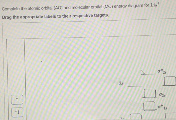 Solved Complete the atomic orbital (AO) and molecular ... Complete the atomic orbital (AO) and molecular orbital (MO) energy diagram for Li2+. Drag the appropriate labels to their respective targets. Question: Complete the atomic orbital (AO) and molecular orbital (MO) energy diagram for Li2+. Drag the appropriate labels to their respective targets. This problem has been solved! See the answer