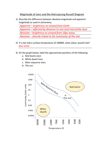 PDF Lesson Plan G2 The Stars - Starry Night Education Give each student a Hertzsprung-Russell diagram worksheet. 2. Use the data from Table G2a to plot each of the 12 stars on the H-R diagram. Star color is on the horizontal axis and star temperature is on the vertical axis. 3. Label each star's data point with the name of the star. 4. Draw a curve as best you can that joins the data points smoothly. Hertzsprung Russell Diagram Teaching Resources | TpT Results 25 - 48 of 238 — Browse hertzsprung russell diagram resources on Teachers Pay Teachers, ... Diagram Worksheet | Space Science Notebook | Middle School. PDF Creating a Hertzsprung-Russell Diagram Measure the diameter of each star and place them in the H-R Diagram Graph according to their size and color. 5. Tape or glue the stars to the diagram. 6. If you have more than one star that looks alike in diameter and color, group them in a small area on the graph. 7. Use the graph to answer the questions. Hertzsprung-Russell Diagram Activities HR Diagram is an exercise that you can print out. It provides background theory and tables of bright and nearby stars for you to plot on the accompanying HR plot and frequency plot. HR Diagram Simulator allows you to place 1, 10 or 100 stars on the main sequence then compare their evolution off the main sequence either in steps or as a movie.